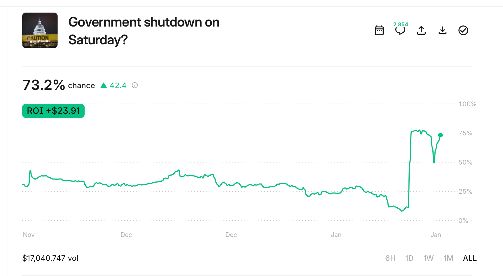 Before this -- based on research and conversations with current and former government employees -- my thesis was moving in the direction of a “Yes” being overpriced by about 11% and that was the safest approach based on the unexpected nature and rapid positional swings was to take advantage of limit orders and trade on headline-based sentiment swings throughout the day. I managed to capture 16% of the swing before bed, and I anticipate further volatility.