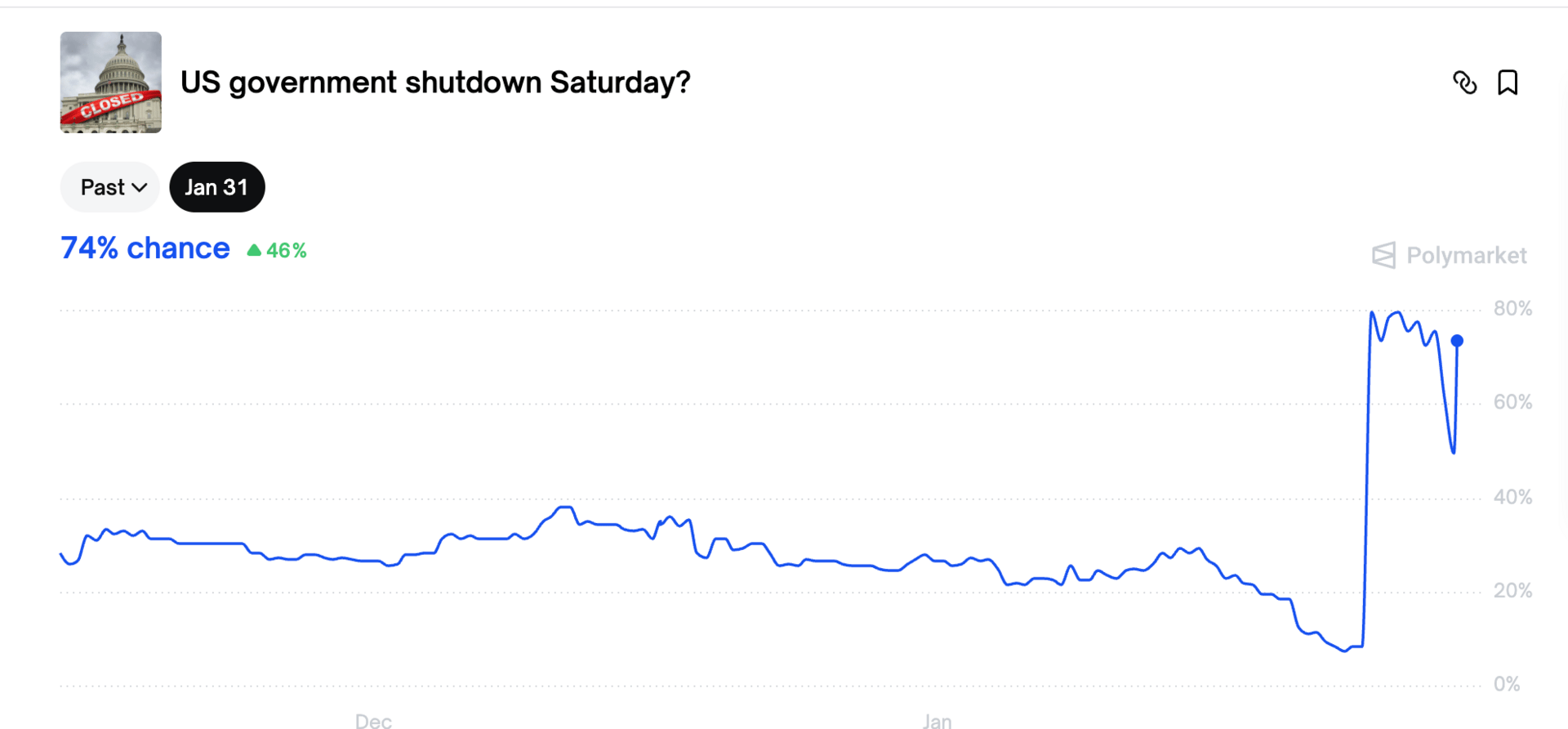 As of writing, Kalshi has the odds of a shutdown at 73.2% and Polymarket has is at 74%.