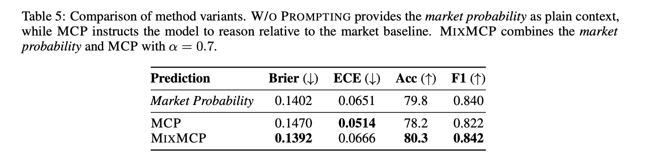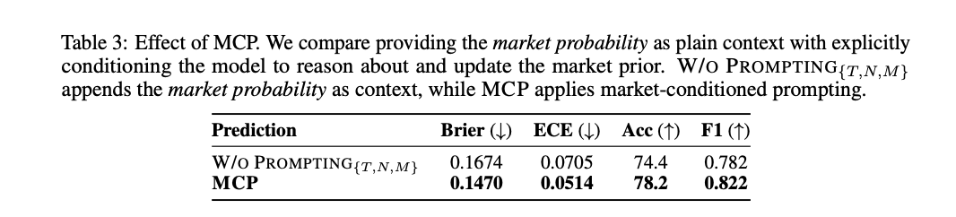 Researchers also tested with prompting (i.e., their MCP method), where they framed the market probability as a prior to be evaluated and updated. Here they used this prompt:
