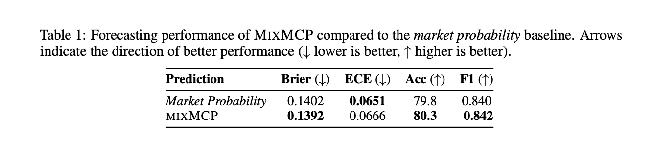 They found that MixMCP consistently outperforms the market baseline, and that “by dampening the LLM’s posterior update with the market prior, MixMCP yields more robust predictions than either the market or the LLM alone.”