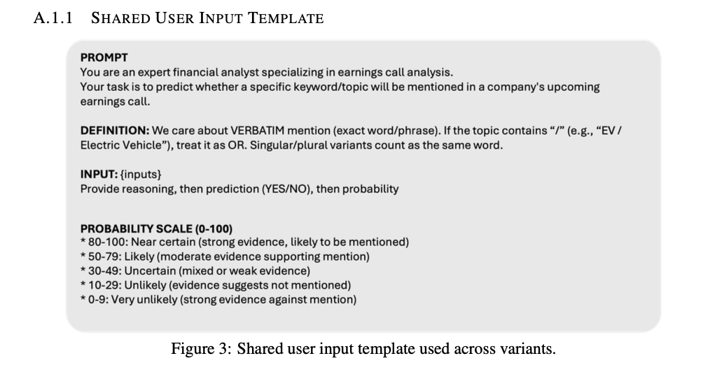 …on 856 Kalshi earnings-call mention market contracts that spanned 50 companies and 70 earnings events from April through December 2025. The forecast cutoff was set at 7 days before each earnings call, and the LLM (GPT 5.1) was given up to 100 company-related news articles and the prior quarters’ earnings call transcripts as context.
