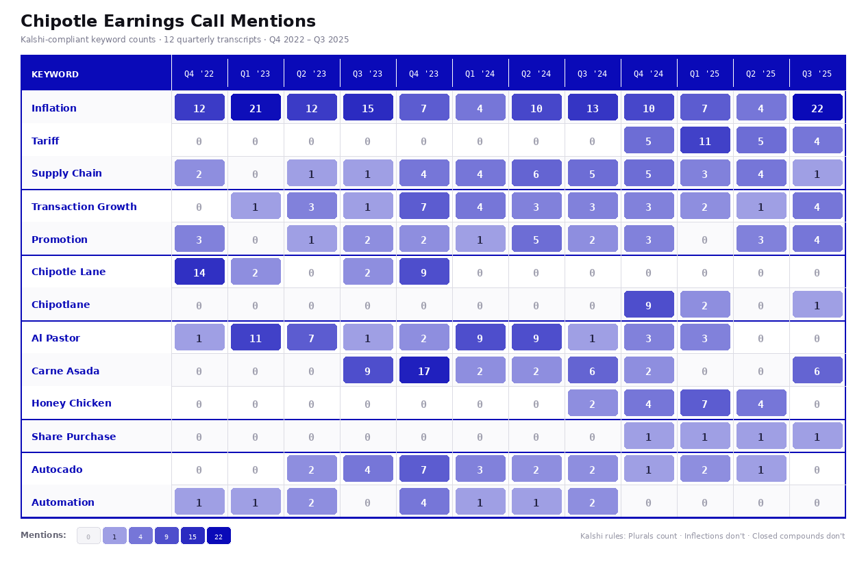 This afternoon Chipotle has its 2025 Q4 earnings call at 4:30 pm ET. We read through their last 12 earnings call transcripts (sourced from Morningstar) and counted each potential mention using our Mention Markets x Earnings Call Dashboard Tool.